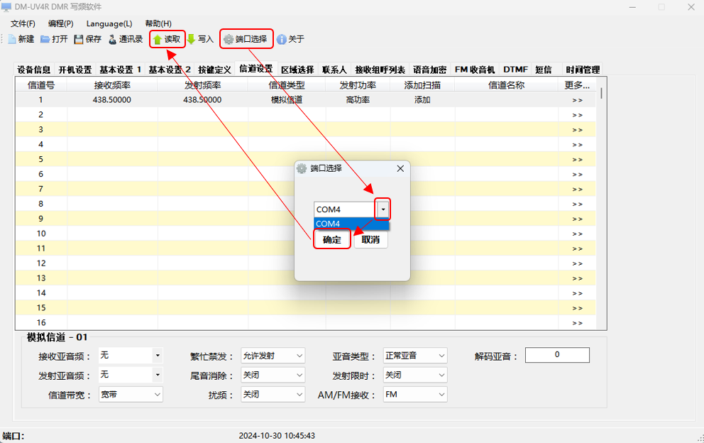 打开写频软件后,首先应该选择端口,我们这里的端口是COM4端口。选择正确通讯端口后,只要选择读频,就能把对讲机中现有的信息读出来说明通信正常。
