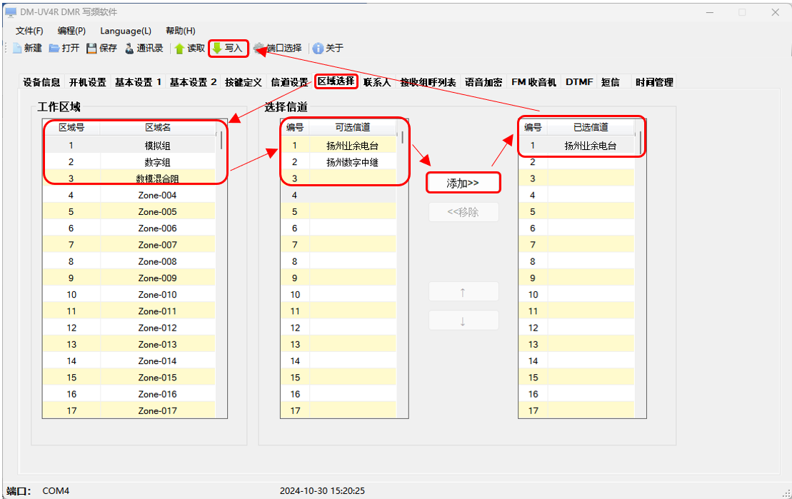 最后,当我们把所有设置做好之后。有一点,就是设置区域,也就是把信道对应到对讲机的频道里。这里我们使用区域功能,对信道进行排布就可以(如下图)。