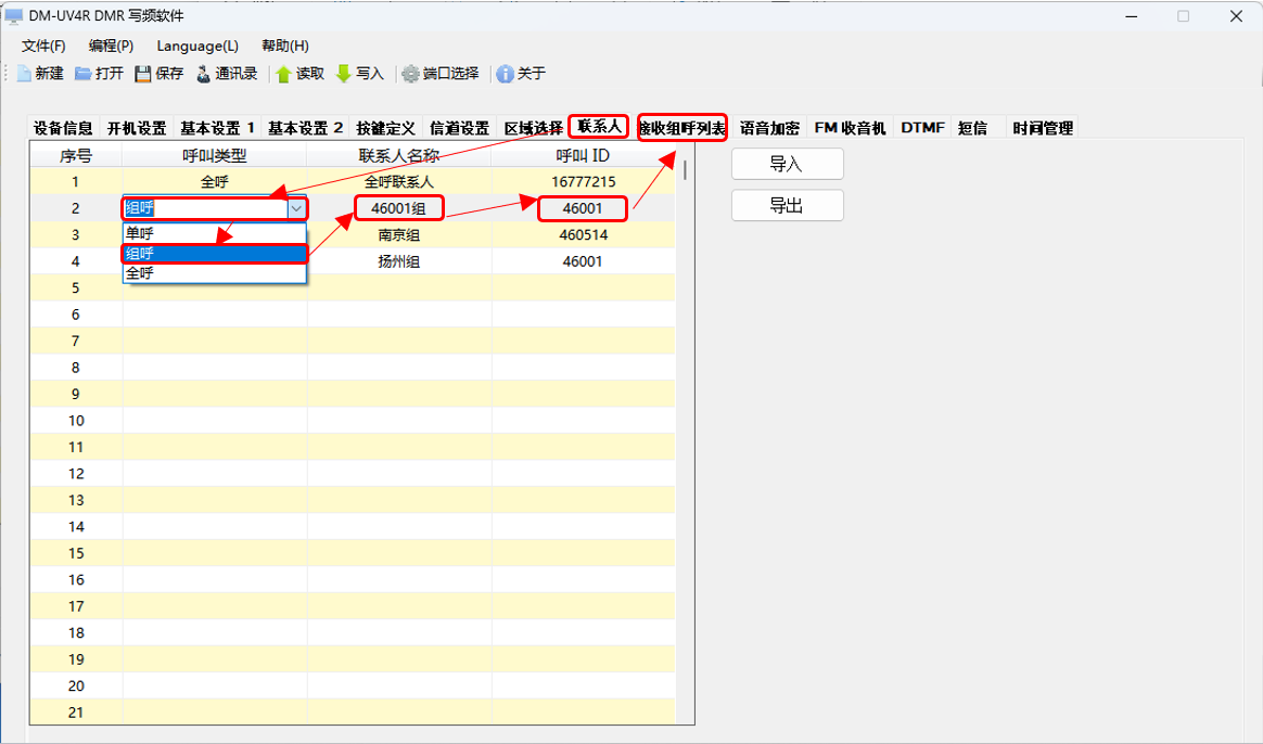 写频软件选择联系人界面,添加联系人ID和组呼ID(如下图)