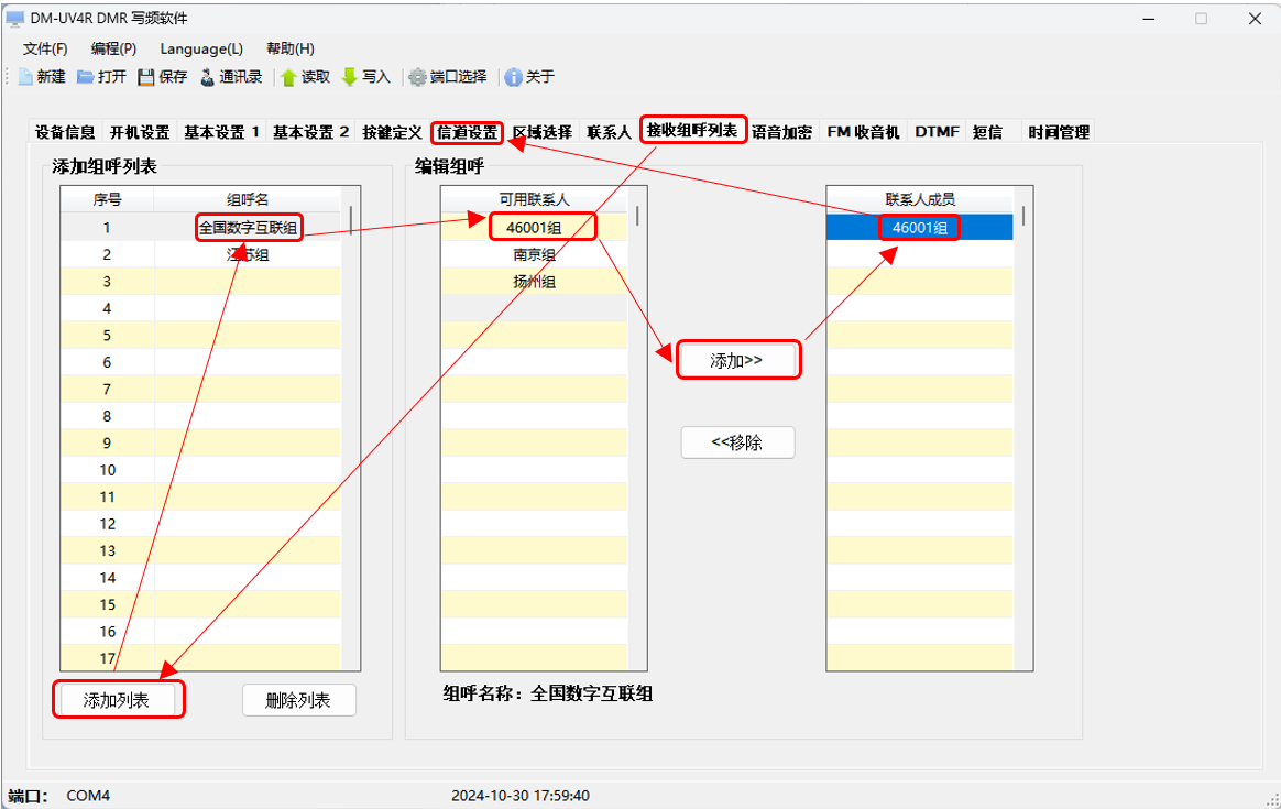 呼叫联系人:46001组 (就是设置联系人中的组呼ID)这个是用来发射信号的组,不设置无法发送语音到相应组中