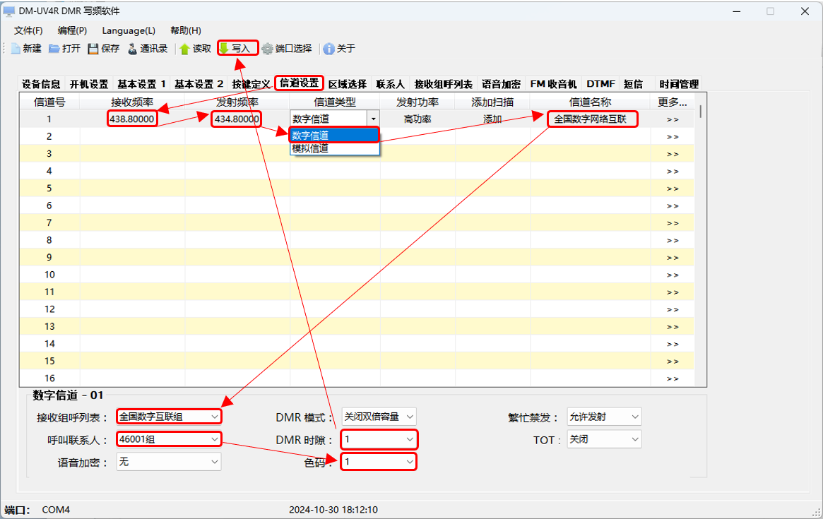本章节讲述是数字写频,这里我们主要介绍如何完成数字写频,保证手台能够正常通信。涉及参数较多按照如下步骤设置:设置联系人→设置数字收发联系组→设置数字频率到写频率。